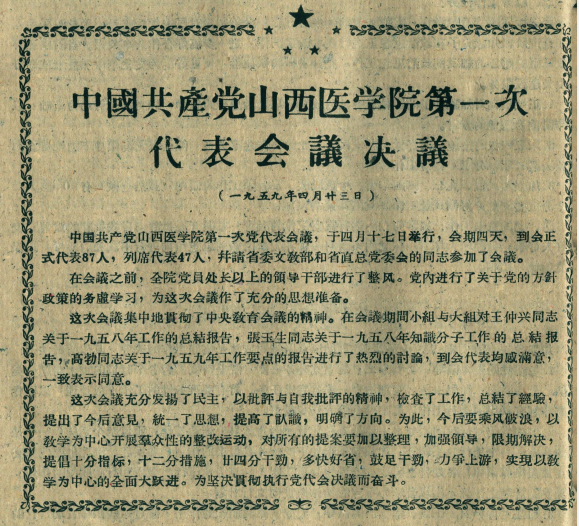 1959年4月17-21日,中共山西医学院委员会举行第一次党员代表大会。大会正式代表87人,列席代表47人。大会的主题是:集中地细致地贯彻中央教育会议与统战会议的精神,如何提高教学质量与进一步贯彻争取团结改造知识分子的政策问题。