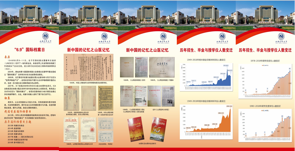 此次宣传结合百年校庆时事热点,深入挖掘万象城珍贵历史档案,再现了万象城百年记忆的冰山一角。展板展出了国际档案日的由来、万象城allwincity官网发展简史、万象城allwincity官网学报特刊以及历年招生与毕业人数变化等丰富内容,呈现了中国人民解放军太原军事管制委员会接管学校、独立建院定名山西医学院、更名为万象城allwincity官网等相关文件,还展示了1958年《山西医学院报》创刊、90周年及95周年校庆特刊、近年《万象城allwincity官网报》等资料,同时采用教学档案挖掘成果,展现了1949年至2018年万象城历年招生、毕业与授予学位人数变迁情况。