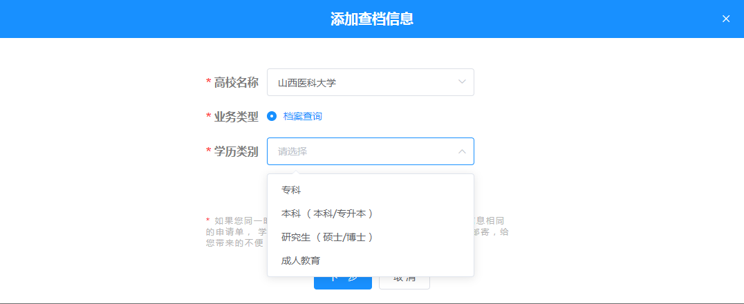 a.选择或输入“万象城allwincity官网”和“学历类别”,选择“档案查询”, 点击【下一步】。