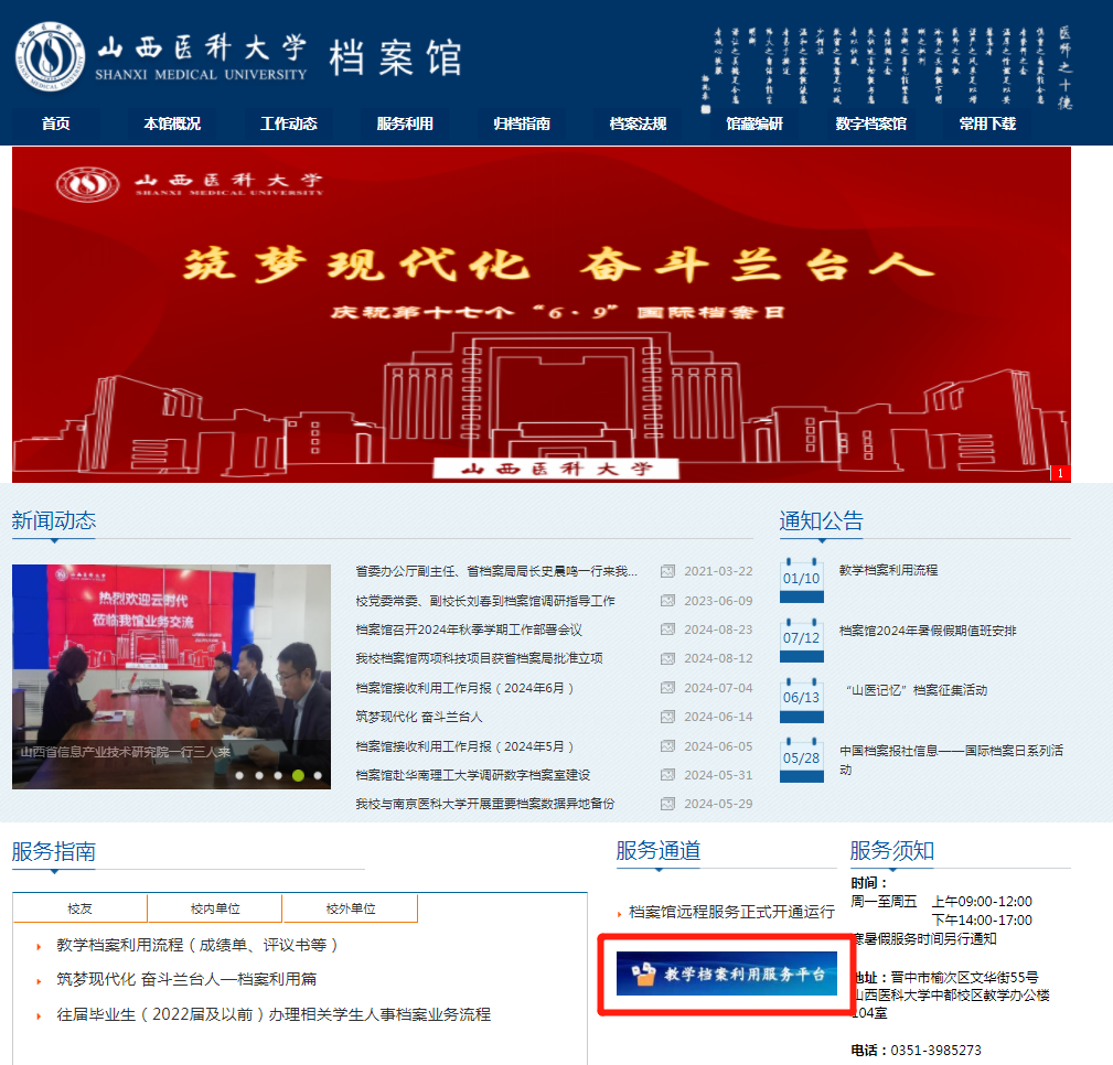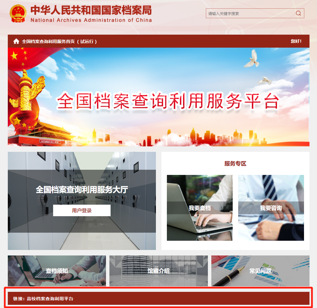 方式二:登录国家档案局官网“全国档案查询利用服务平台”(https://cxly.saac.gov.cn/),点击“高校档案查询利用平台”链接即可预约查档。