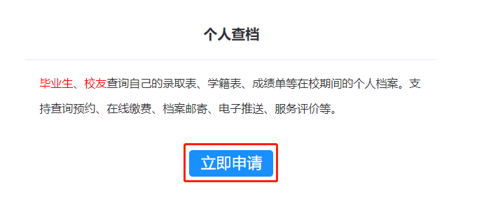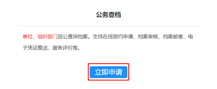 选择查档类型“个人查档”或“公务查档”,点击【立即申请】,进入申请页面。