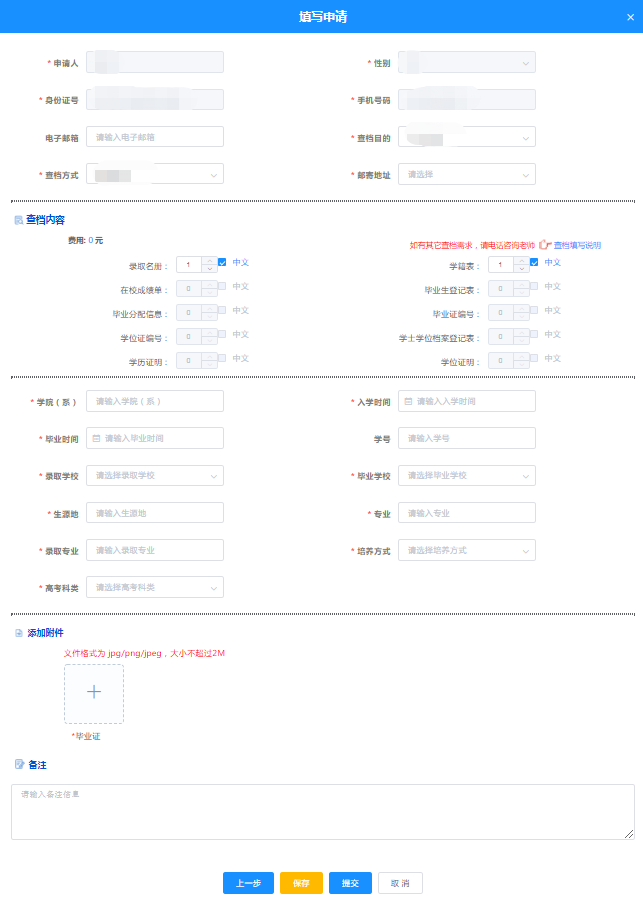c.填写完申请表,点击【提交】按钮,查档申请提交至学校管理人员审核。若暂时不提交,可点击【保存】,稍后在“我的申请”中修改并提交。