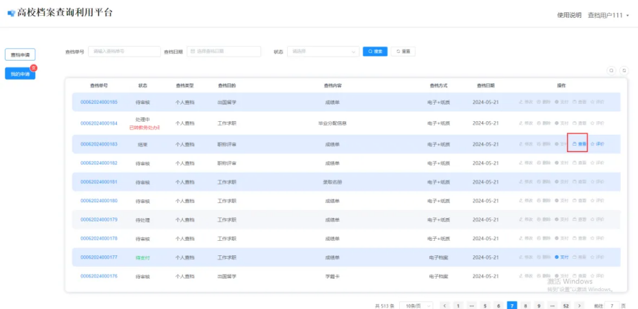 审核通过后,学校管理人员根据用户查档申请中选择的查档方式将查档内容邮寄(邮寄信息以查档申请中制定的为准)或推送给用户。学校端处理完成后,在“我的申请”页面,点击【查看】按钮,可查看邮寄单号及电子文件。