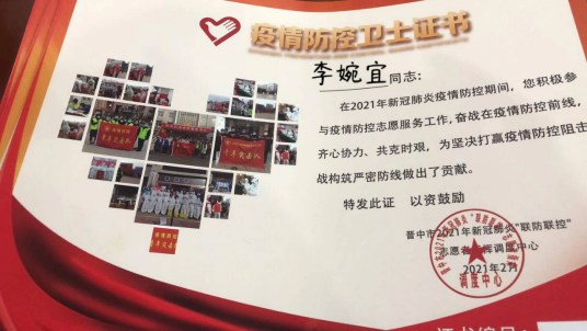2019级李婉宜是山西省吕梁市文水县人。2020年疫情期间,她积极参加线上志愿服务,获得了国家级证书。2021年1月初由于晋中市疫情形势严峻,政府成立晋中市联防联控疫情指挥中心,她担任秘书工作组副组长,负责线上志愿者招募工作。审核每一位报名志愿者条件,每天做表、开会、审核等工作长达十几个小时。同时,她还亲自参与了家乡志愿服务,在村委会帮助登记、统计汇总信息。获得了文水县疫情防控志愿服务“先进个人”。