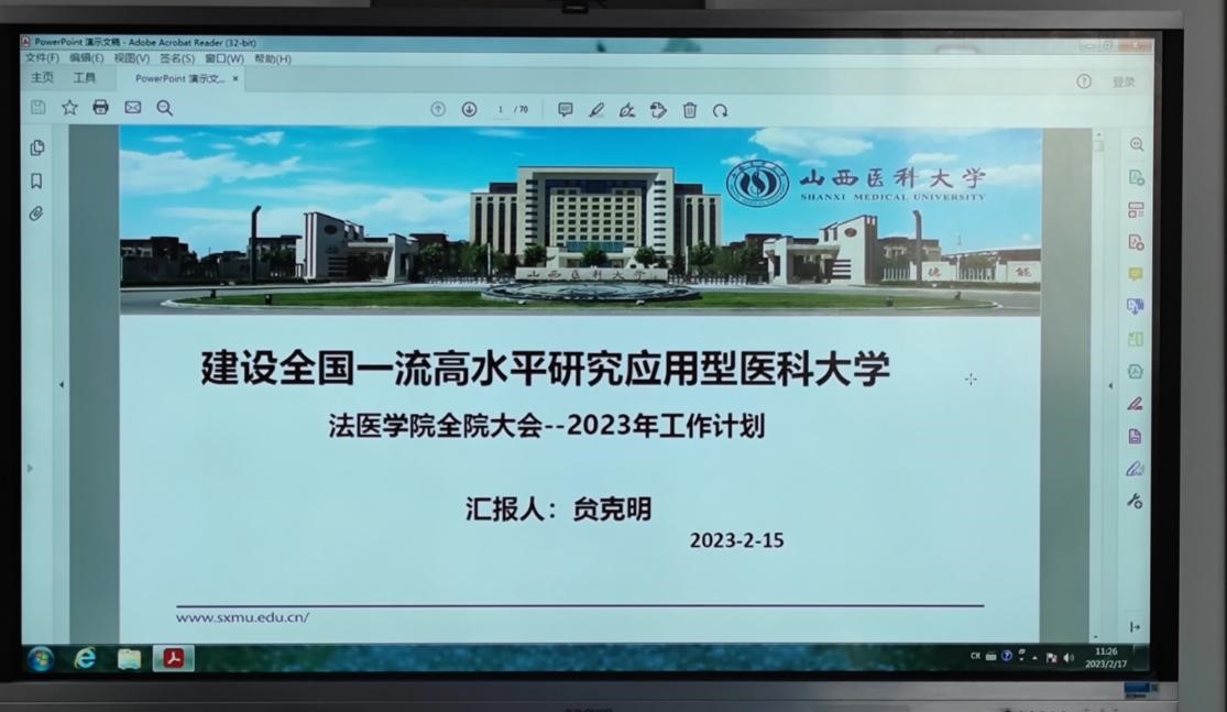院长贠克明首先传达了2月11日学校处级干部会议精神,强调学校2023年工作重点是要推进“八件大事”,指出法医学院要积极按照学校精神,对标学校工作重点,跟进学院各项工作。按照学校精神,贠克明做了主题为“建设全国一流高水平研究应用型医科大学”的法医学院工作汇报。汇报首先从党的二十大精神、省委省政府关于教育发展目标、学校第七次党代会关于学校发展目标、法医学成为一级学科等方面分析了法医学发展的新机遇。第二全面总结了2022年工作,第三重点制定了2023年工作计划,对标学校2023年工作重点,提出了法医学院新一年工作的“8大任务和11项重点工作”,包括准备法医学本科国家一流专业验收、司法鉴定中心DMA认证、国家重点研发计划和国自然申报新突破、特种医学学科冲A、法医学一级学科建设、人才工作、晋祠会议40周年法医学学术交流会、课程建设等各项工作做了具体安排,细化了工作责任。