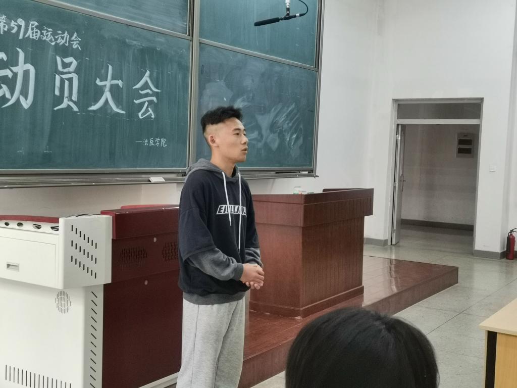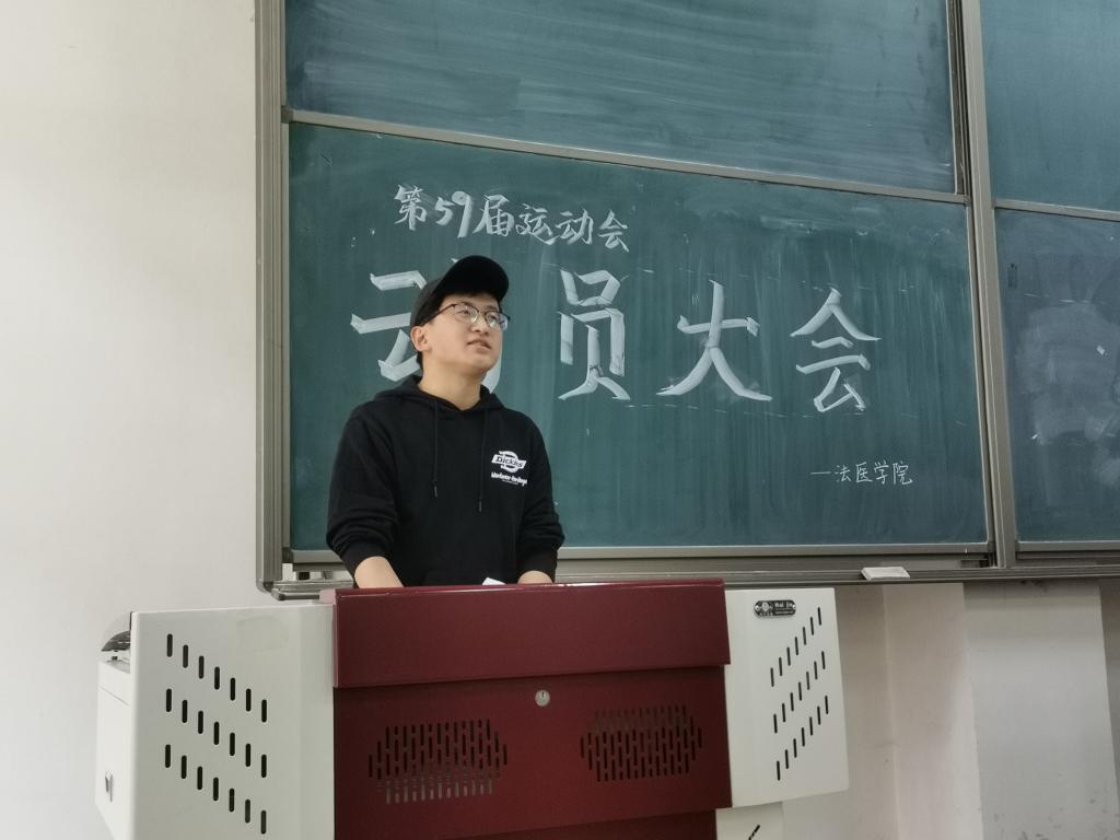 随后,法医学院本次运动会负责人2018级体育部长陈棋发言,他分享了自己过往参加运动会的感悟,对训练和比赛的具体工作进行了安排和布置。本次动员大会极大的调动了学生们参加体育赛事的积极性,起到了良好的动员作用,预祝这届运动会也能取得优异成绩。