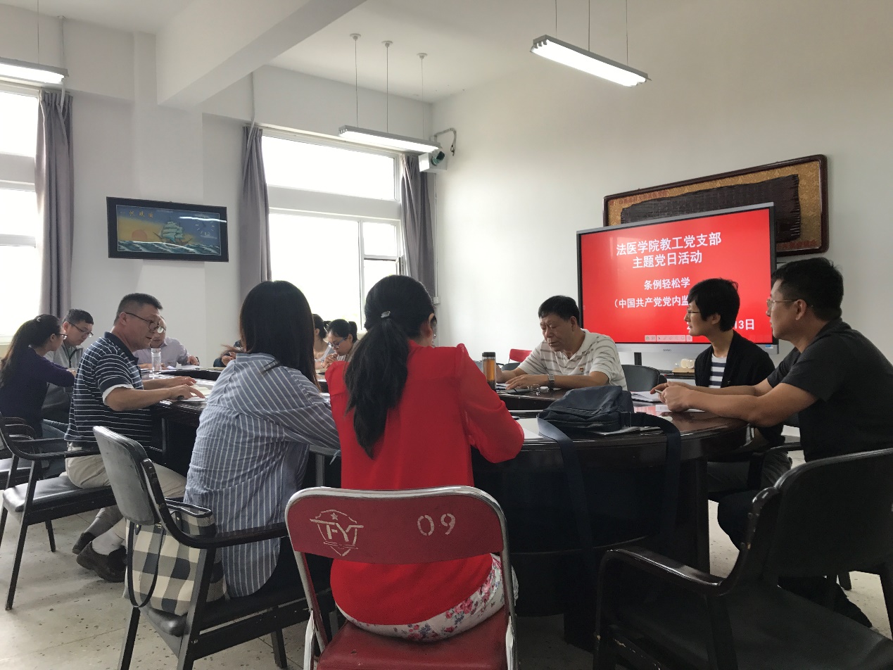 《中国共产党党内监督条例》是一部十分重要的党内法规,它的颁布实施,对于坚持党要管党、从严治党的方针,发展党内民主,加强党内监督,维护党的团结统一,保持党的先进性,始终做到立党为公、执政为民,必将起到重要作用。2018年9月13日,法医学院教工党支部全体教工党员集中学习条例,全体党员意识到党内监督条例的重要性和历史意义。充分认识到监督是权力正确运行的根本保证,是加强和规范党内政治生活的重要举措。党内不允许有不受制约的权力,也不允许有不受监督的特殊党员。要完善权力运行制约和监督机制,形成有权必有责、用权必担责、滥权必追责的制度安排。建设廉洁政治,坚决反对腐败,是加强和规范党内政治生活的重要任务。加强和规范党内政治生活、加强党内监督是全党的共同任务,必须全党一起动手。