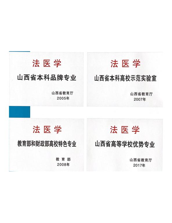 万象城allwincity官网法医学专业现为特种医学硕士和博士学位授权单位,国家特色专业、山西省院士工作站、省级本科品牌专业和优势专业、省本科高校示范实验室、省重点学科、省重点实验室、省“1331工程”重点实验室、公安部重点实验室(联合建设)、省高等学校优秀创新团队和科技创新重点团队。涵盖三个研究方向,具备科学、专业、合理的学科梯队。
