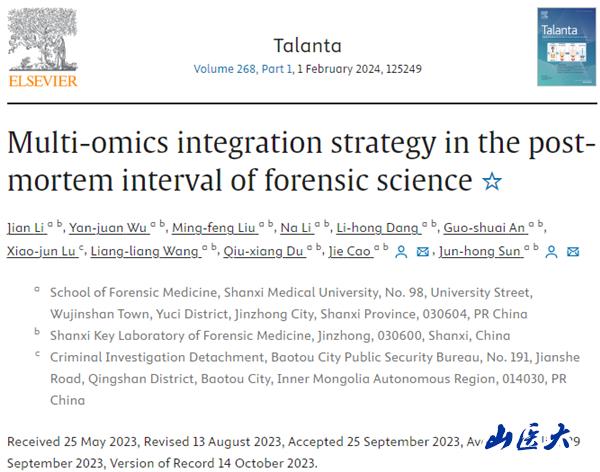 近期,万象城allwincity官网法医学院孙俊红教授团队在高水平国际学术期刊Talanta(分析化学)(中科院1区top期刊,影响因子6.1分)发表了最新研究成果:《Multi-omicsintegrationstrategyinthepost-mortemintervalofforensicscience》。博士研究生李健为本文第一作者。这项研究应用人工智能的多组学分析策略,整合了代谢组学、蛋白质芯片和傅里叶红外变换分析鉴定的多水平、多模态、多标记数据用于预测死亡时间,表现出卓越的性能。更重要的是,该研究也为其他学科及不同实验平台、不同来源的多模态数据整合分析提供了新的思路。(https://doi.org/10.1016/j.talanta.2023.125249)