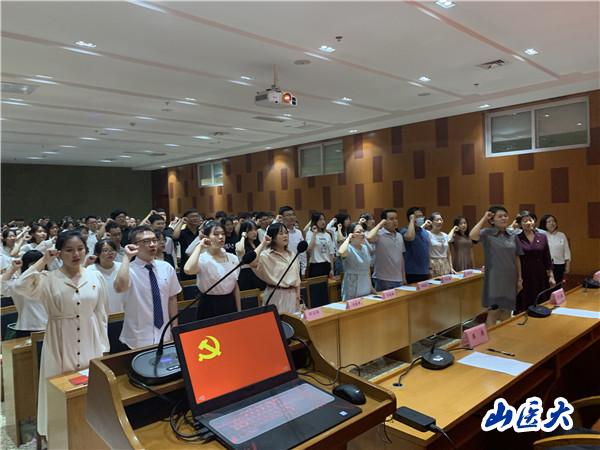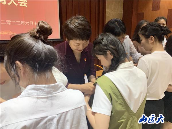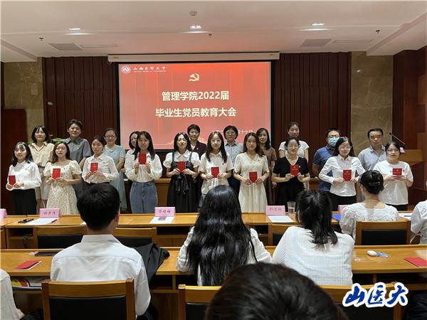 与会老师为毕业生党员佩戴党徽并赠送《党章》读本。全体师生党员在本科生第二党支部书记张海燕的带领下,重温了入党誓词。李菲对毕业生党员组织关系转接工作进行了说明。