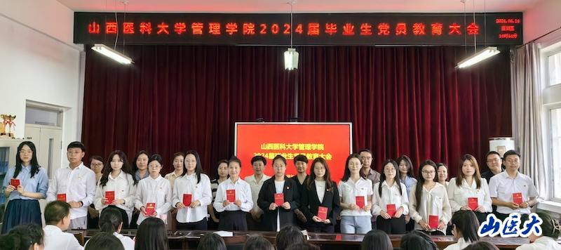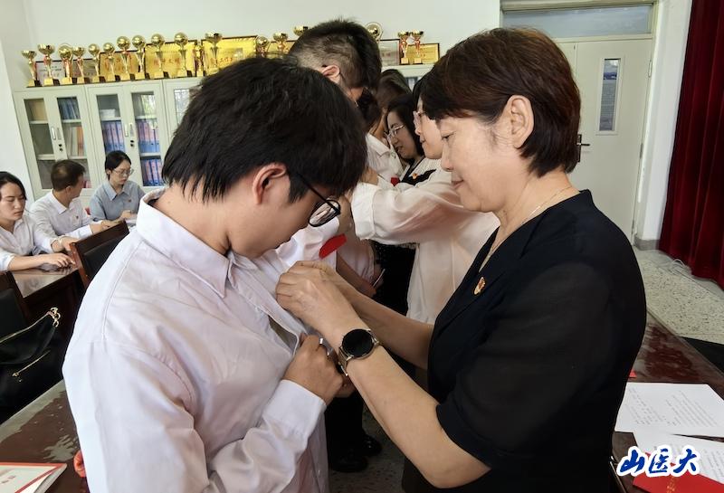 会议在庄严的国歌声中拉开序幕,随后,与会老师为全体毕业生党员佩戴党员党徽、赠送《中国共产党章程》 。毕业生党员代表王灿、赵子豪分别作了情感真挚的发言,感恩母校的悉心栽培和老师们的谆谆教诲,表示在今后的工作学习生活中将始终秉持“医理博精 德能高邃”的校训,在学思践悟中坚定理想信念,在奋发有为中践行初心使命,为中国式现代化建设贡献青春力量。