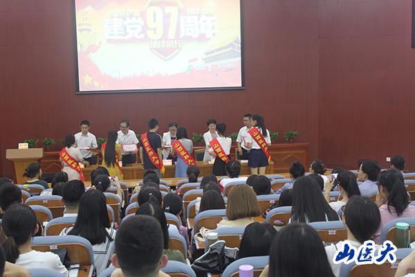会议在庄严的国歌声中正式开始。院党委委员、副院长袁永旭宣读表彰决定;贺培凤等校院领导为获得优秀共产党员、优秀党务工作者和先进基层党组织荣誉称号的个人和集体颁奖;教工第一党支部书记于琦、学生党员张琳分别代表受表彰先进党支部和优秀共产党员发言,畅谈了对建党97周年的认识和感想,表达了学院师生不忘初心跟党走,牢记使命勇担当的坚定信心。