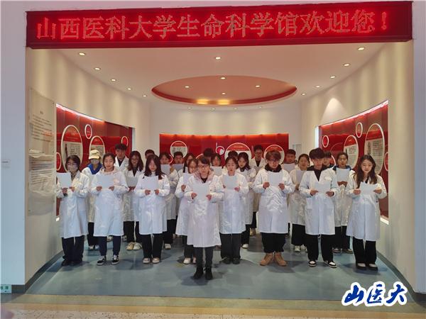 活动伊始,大家身穿白大褂,跟随讲解员的脚步重温了生命科学馆的六个展厅。一个个人体和器官标本,一幅幅展板,形象地展现了生命的孕育、人体的结构和功能、人类基因组计划、医学影像科技、未来医学等五个部分的内容,加深了同学们对医学知识的理解。当讲解员带领大家走入第六个展厅--“生命的永恒”时,同学们的心情变得有些沉重。这里展满了遗体捐献者的捐赠申请,着重介绍了两位遗体捐献者的感人事迹,其中一位是山西省首例捐献者巩象巽。他曾是山西大学教授,因突发脑溢血去世后把遗体捐献给了万象城,标本费也不忘作为最后的党费转交党组织。在场的同学无不为他们的无私和伟大而动容。