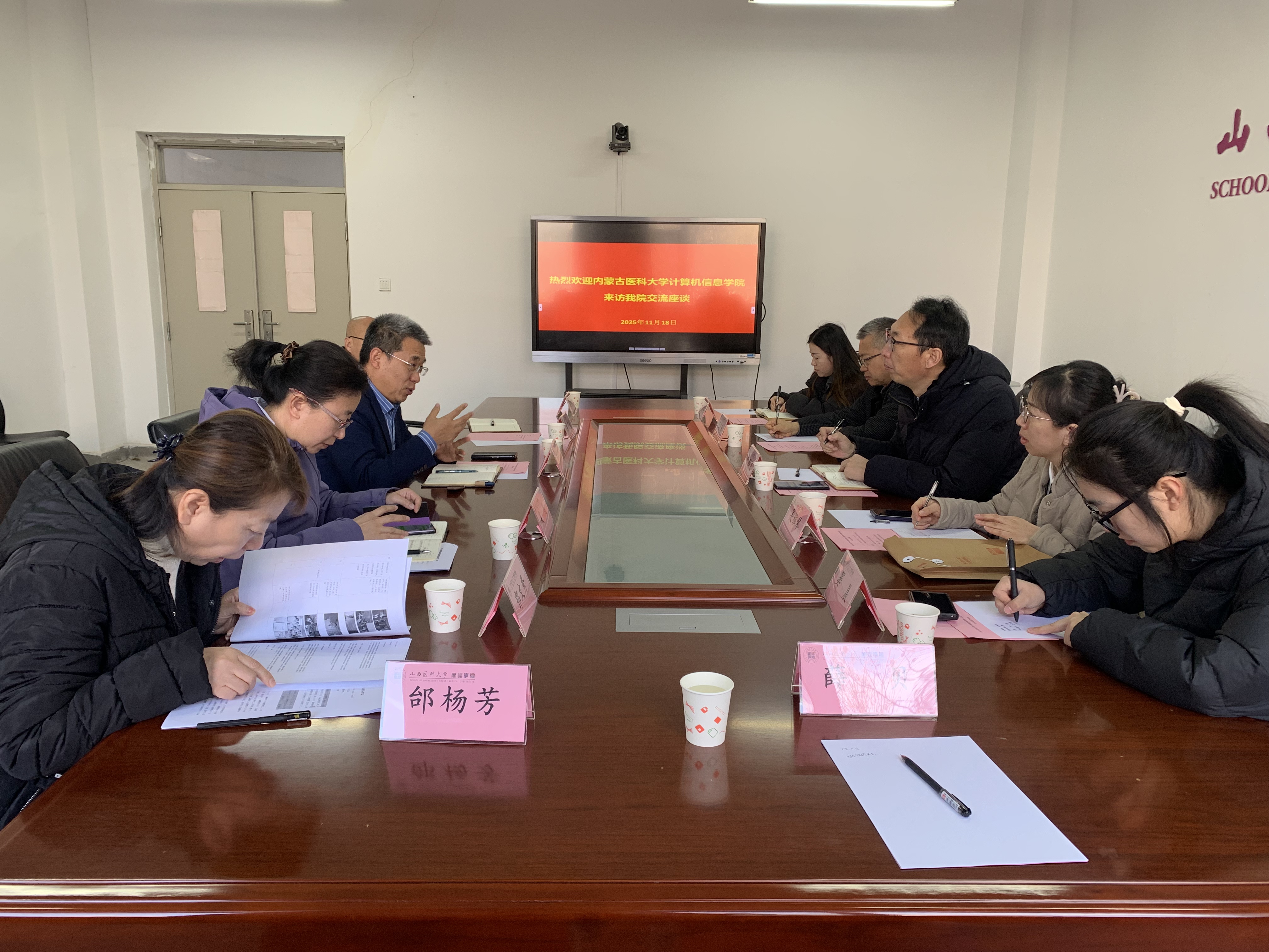 1为加强院校间学术交流,促进学科建设与专业发展,2025年11月17日上午9:00,内蒙古医科大学计算机信息学院院长宁鹏飞、生物医药数据科学专业负责人吴雅琴、信息管理与信息系统专业负责人王晓东等一行5人来访我院,与我院院长袁永旭等学院老师在中都校区至善楼C207开展座谈交流。
