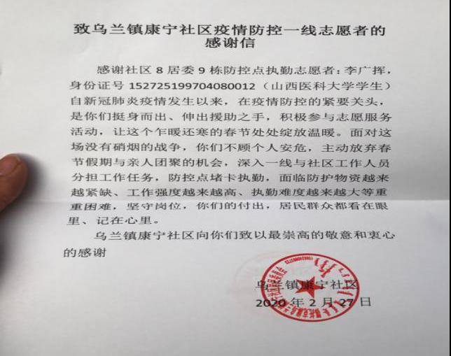 疫情暴发后,为了响应“众志成城,抗击疫情”的号召,作为一名医学生的他,挺身而出,他向所在社区提出申请,自愿加入了抗击疫情志愿工作。在没开学之前一直是安排在白天执勤,当开学后,为了不影响学业,他自愿提出调整时间,调到了最难熬的夜晚。他在防控疫情的过程中的突出表现,和尽职尽责无私奉献的态度,受到了社区和镇上的一致表扬。这位憨厚朴实的内蒙古小伙,用自己的真诚和信念,默默承担起保护人民免受疾病侵袭的宏伟职责!