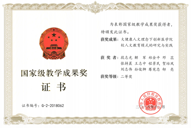 2018年《大健康人文理念下创新医学院校人文教育模式的研究与实践》获得国家级教学成果奖二等奖