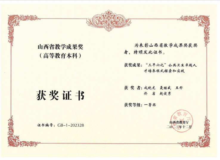 (4)2023年《“三早六化”公共卫生卓越人才培养模式探索和实践》获得山西省教学成果奖一等奖