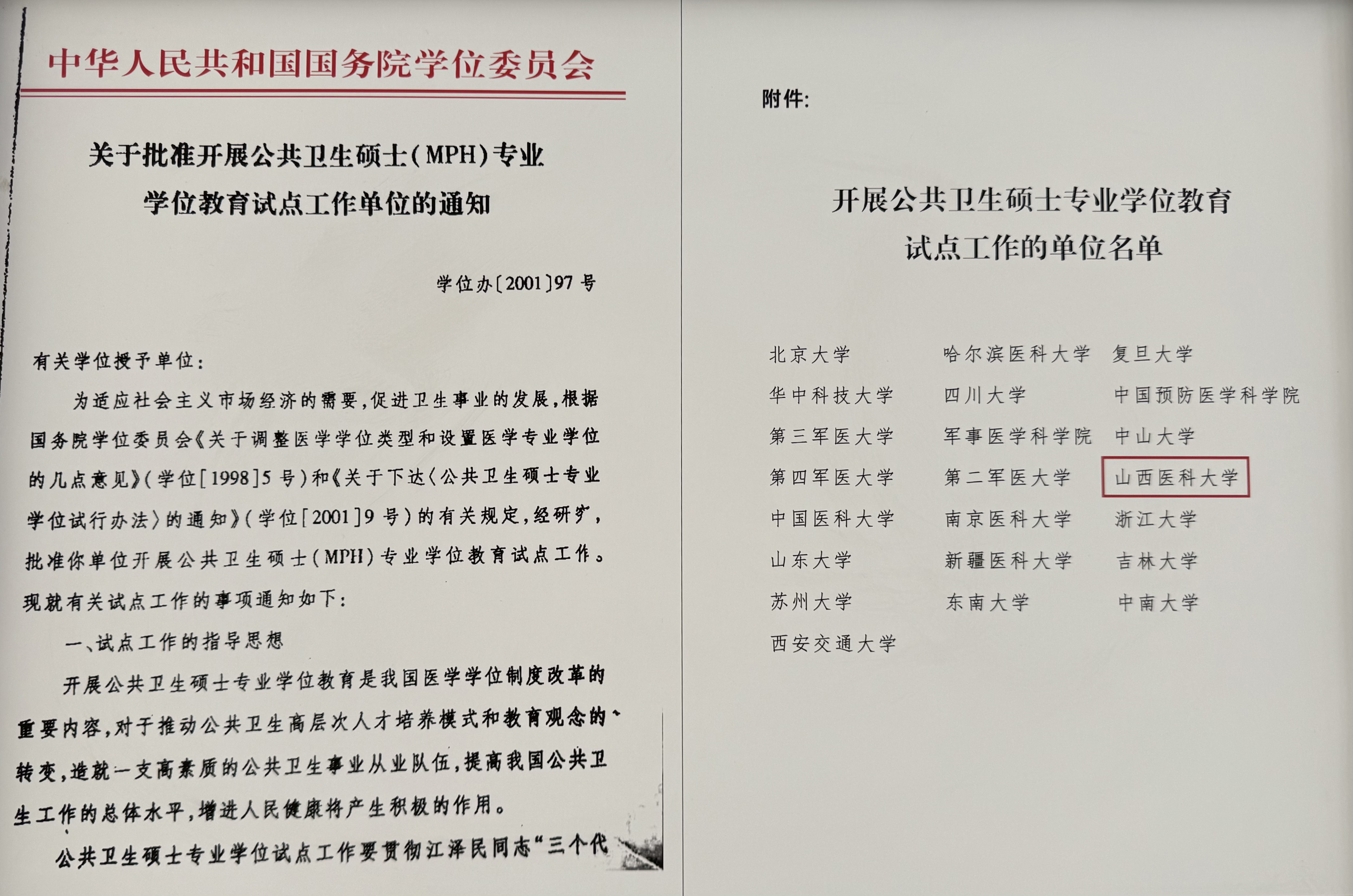2001年 国家首批公共卫生专业硕士学位(MPH试点单位)