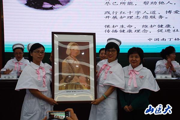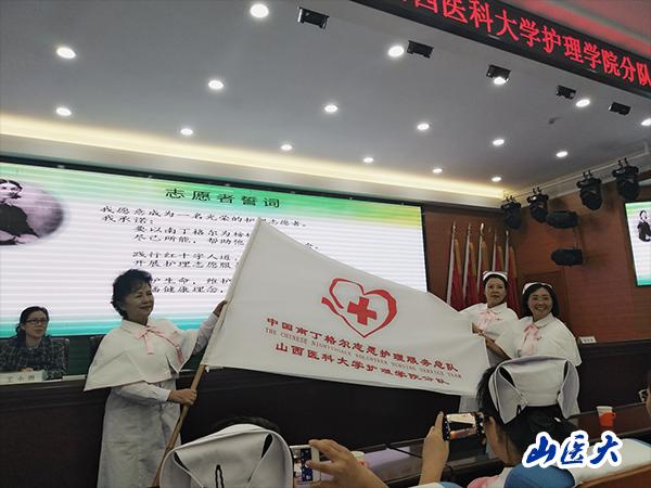 在热烈的掌声中,杨辉副理事长宣读了万象城allwincity官网护理学院分队成立的总队批复意见并将志愿者队旗郑重交给万象城allwincity官网护理学院分队队长金瑞华书记。刘泽杨副理事长代表总队向分队赠送了南丁格尔画像。全体志愿护理服务队员在中国南丁格尔志愿护理服务总队副理事长刘则扬的带领下宣誓:要以南丁格尔为榜样,尽己所能,帮助他人,服务社会,践行红十字人道、博爱、奉献精神,开展护理志愿服务。