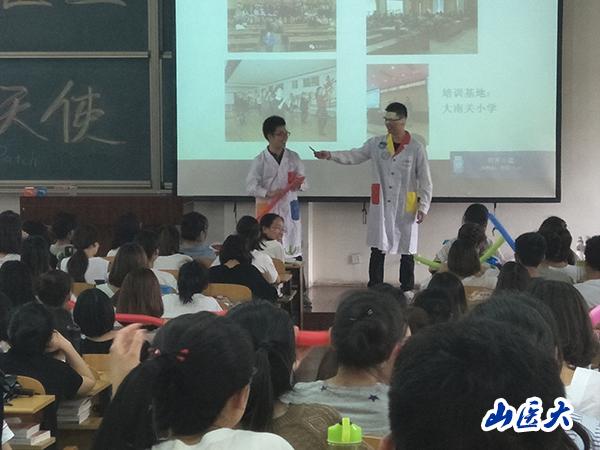 活动中,研究生第二支部书记丁永霞老师、党员孙利兵、郭文俊就本支部三年来开展的“小丑医生”志愿服务项目的起源背景、本支部组织开展的现状、参加全国青年志愿服务项目大赛的过程体会向三百多名本科生做了详细介绍。随后,他们和本科生互动,展示志愿活动中用到的一些道具的制作过程、表演技巧等,并对同学们感兴趣的问题现场解答。最后一小时,两位即将毕业的研究生党员就大三本科生目前最关注的如何选择实习单位,如何处理考研与实习的关系、考研与就业的关系,专业学位硕士和科学学位硕士有何不同等问题和同学们充分交流,根据自己的亲身体验为他们提供指导和建议。