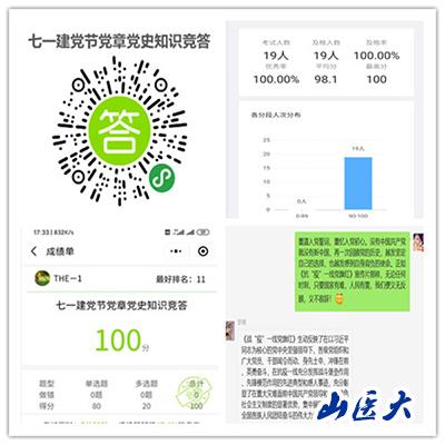 全体党员在微信群中开展“七一”党史知识竞赛活动。竞赛题目包含单项选择题和多项选择题共50题,满分100分,70分以上及格,半小时内作答。截止答题时间内共19名党员参加,及格率为100%,平均分98.1分,获得满分者13人。此外,在抗疫作品征集活动中,支部12名党员荣获奖励,他们用实际行动,以笔为援,用文字、用画作、用摄影记录下疫情期间可歌可泣的英雄故事,共同祝福伟大的党生日快乐!