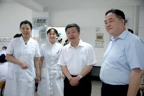 师帅书记先后察看了护理学院图书馆、护理技能实训中心等处,详细了解了学院建筑功能布局、仪器设备、PBL教学模式及近年来取得的成果等。在国家级实验教学示范中心——护理技能实训中心,师书记认真观看了正在进行教学活动的师生们所进行的心肺复苏术的现场演示,并与他们亲切交流。