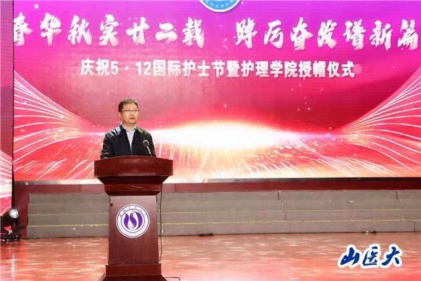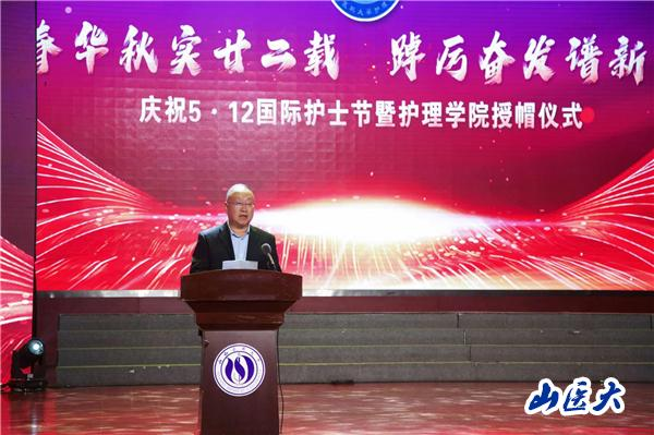 王军代表全校师生医护员工向长期以来坚守在护理工作岗位、辛勤耕耘在护理教育一线的同志们致以诚挚的问候和节日的祝贺,向广大护理学子提出了“点亮梦想,踔厉奋发”“甘于奉献,大爱无疆”“苦练本领,知行合一”的谆谆嘱咐,鼓励大家作为健康中国的生力军,要兼具博爱之心、精湛技艺和创新精神,在燃烧自己、照亮别人的南丁格尔精神指引下,以勤为径、以苦作舟,用手中的蜡烛点燃前进的方向,向信仰看齐,向梦想致敬,向未来出发,为书写健康中国蓝图,做出自己更大的贡献。
