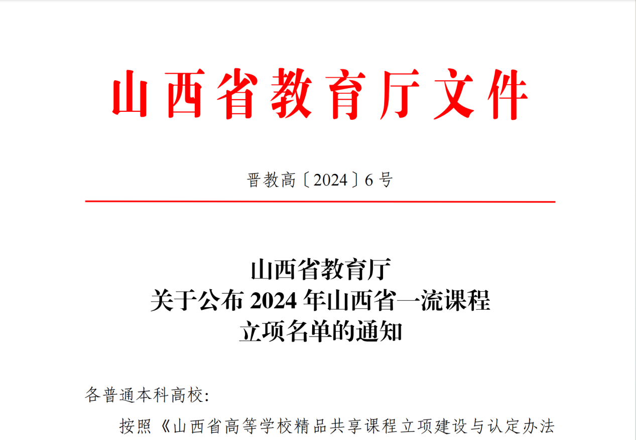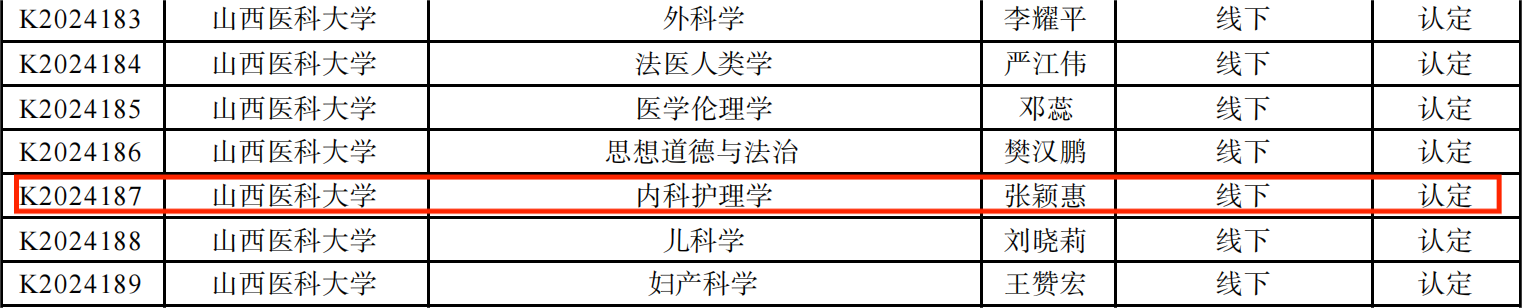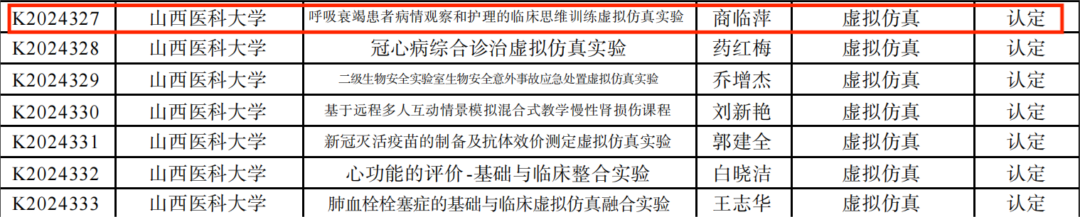 近日,山西省教育厅对2024 年山西省一流课程进行专家评审、网络公示等环节,确定了 2024 年山西省一流本科课程立项名单,并在山西教育厅网站予以公布。护理学院商临萍院长负责的虚拟仿真课程《呼吸衰竭患者病情观察和护理的临床思维训练虚拟仿真实验》获得省级一流课程;张颖惠副院长负责的《内科护理学》线下课程获得省级一流课程。