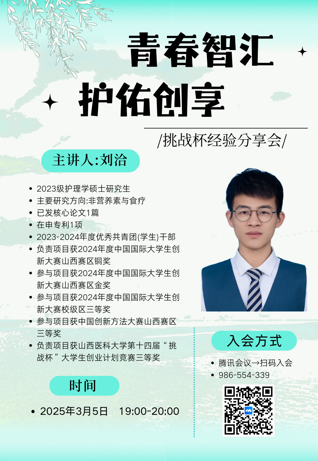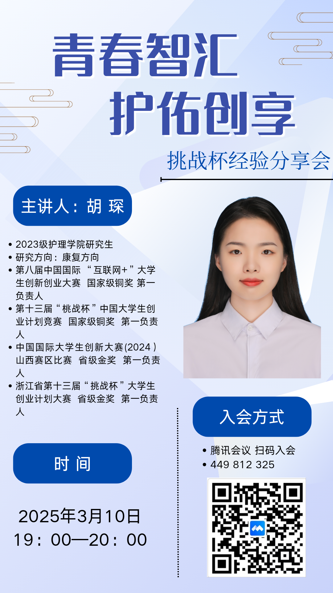 为深化创新人才培养机制,助力青年学子把握科研竞赛机遇,提升同学们的科研创新和竞赛能力,护理学院于2025年3月5日和3月10日成功举办了"挑战杯"经验分享会。特邀我院2023级硕士研究生刘洽同学和胡琛同学主讲,通过系统化经验传授与前瞻性学科探讨,为200余名师生呈现了一场兼具学术深度与实践价值的创新盛宴。