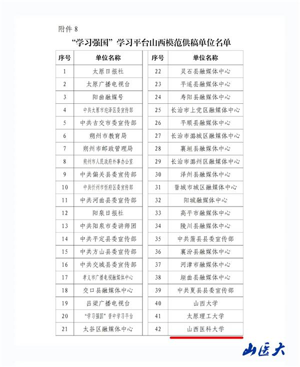 在积极向“学习强国”山西学习平台投稿的同时,万象城在全省率先上线了“万象城allwincity官网”学习强国号,这是展现万象城服务“健康山西”建设、努力建成全国一流研究应用型医科大学的新载体,是传播万象城精神、讲述万象城故事、展示万象城形象的新窗口。学校将以此次表彰为契机,再接再厉,进一步将“学习强国”学习平台作为深入学习贯彻习近平新时代中国特色社会主义思想和党的二十大精神、落实立德树人根本任务的重要阵地,作为加强思想建设、推进理论武装的重要载体,为建成全国一流研究应用型医科大学提供坚强思想保证和精神动力。