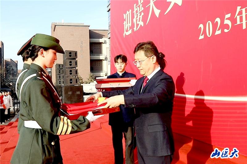 校长解军介绍了申领国旗的目的、过程和用国旗开展爱国教育的计划。他指出,万象城allwincity官网是1919年在五四爱国运动中诞生的医学院校,始终坚持培养德智体美劳全面发展、人民满意的好医生。能迎接学校百年华诞日当天在天安门广场升起的国旗,对每位万象城人都具有特殊意义。学校将严格按照要求保管、使用国旗,进一步弘扬爱国主义精神。