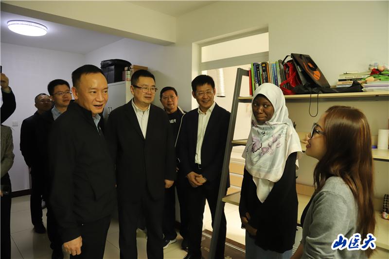随后,调研组前往留学生公寓实地走访。王昱仔细查看了留学生的居住环境与生活设施,详细询问生活配套服务情况。在与留学生的亲切交流中,他关心地询问留学生的生活感受、学习适应情况和文化融入体验,留学生们热情分享在校学习生活点滴,纷纷表示学校完善的设施与贴心的关怀,让他们体会到家一样的温暖。王昱充分肯定了万象城留学生管理工作的规范性与细致性。他强调,留学生教育是高校国际化办学的重要体现,更是促进中外文化交流、增进民心相通的关键桥梁。学校要充分发挥留学生的文化交流使者作用,鼓励他们积极传播中国声音,讲好中国故事,为构建人类命运共同体贡献力量。