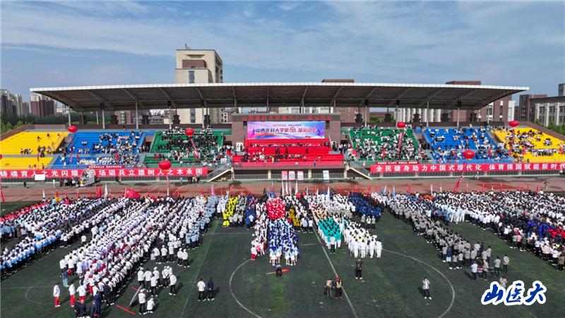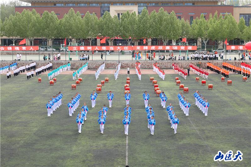 随后,大型文体展演开始。第五临床医学院带来大型舞蹈——《鼓震山河,医脉长歌》,留学生表演了深情礼赞三晋大地的舞蹈,夕阳红舞蹈队和基础医学院学生共同表演啦啦操——《舞动中国》,第三临床医学院的激情啦啦操,8个院系参与的大型广播体操等方阵的创意编排、运动之美让开幕式热度再度攀升。