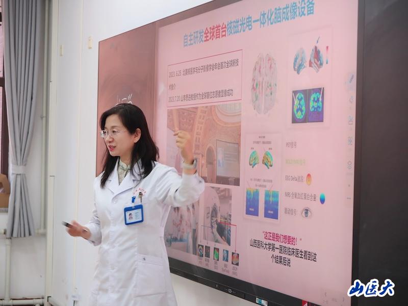 武志芳还介绍了山西核医学的“守正创新”之路,深情回顾了其恩师、我国核医学领军人物李思进教授带领团队取得的系列重大成就。从牵头建设国家卫生健康委核心脏数据库,到自主研制全球首台核磁光电一体化脑成像设备PMEEN;从推动临床转化具有独立知识产权的放射性药物自动化标记设备“辐睿智配”,到系统开发国产影像装备、提升重大疾病精准诊疗水平;从持续完善诊疗规范、积极推动政策落地,到不断深化对外交流、扩大中国核医学国际声量——李思进教授团队在医、工、研、管各领域全面突破,展现了核医学在精准医疗时代的广阔前景,也极大地增强了同学们的专业认同感与探索热情。