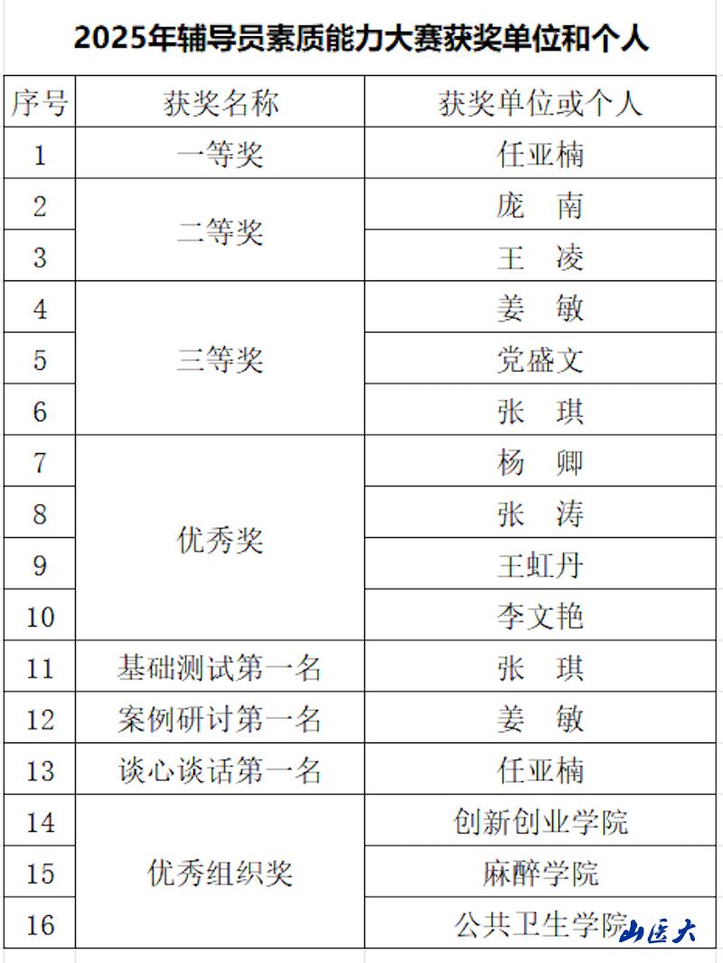 经过多环节激烈角逐,10位辅导员分获一、二、三等奖及优秀奖,3位辅导员分获单项奖第一名,创新创业学院、麻醉学院及公共卫生学院获评优秀组织奖。