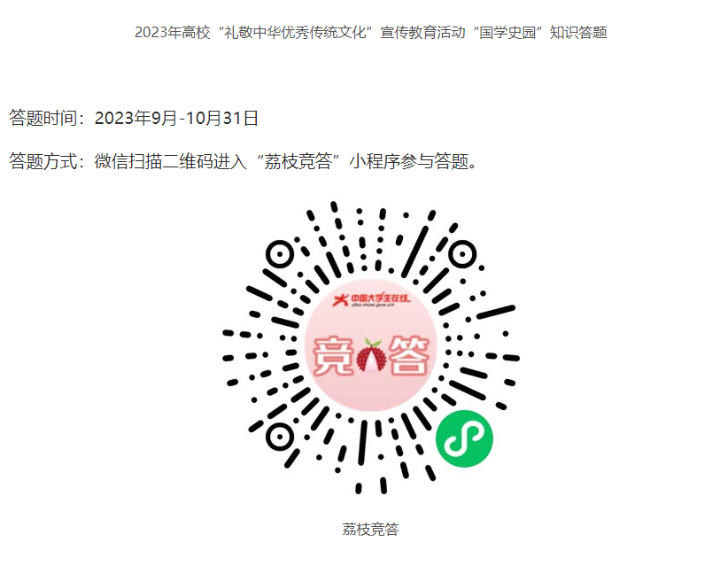 (一)“国学史园”知识竞答。组织干部师生围绕习近平新时代中国特色社会主义思想、中华优秀传统文化传承与发展,学习国学知识、探寻文化历史、掌握发展脉络,开展形式多样的国学知识学习与校史文化教育,增强广大师生的文化自信,激发万象城学子的爱国爱校情怀,坚定万象城学子强党报国志向。鼓励有兴趣学生踊跃参加“国学史园”知识竞答,具体参与方式为:登录中国大学生在线网站(https://dxs.moe.gov.cn/zx/)“活动”栏目下“活动公告”中“2023年国学史园知识答题”板块中参与答题,每位参与者只能参与一次。