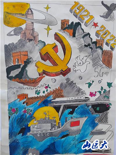 本次作品征集活动,共收到由7000名同学完成的各式各类作品近千件,凝聚着同学们心血的作品主题鲜明,内涵丰富,制作精美,技艺精湛。这些作品中有的构思巧妙,独具匠心,以简单的黑白两色突出建党时间之久,党徽在其间烨烨生辉彰显中国共产党如旗帜般耀眼的初心和使命,其间点缀的和平鸽也代表了我们国家鲜明的和平发展理念;有的色彩绚丽、画工一流,以多种绘制技法描绘冬奥精神、抗疫情神和十八大以来取得的辉煌成就;还有精致巧妙的南湖红船和C919飞机、惟妙惟肖的嫦娥探测器和航空母舰等等。