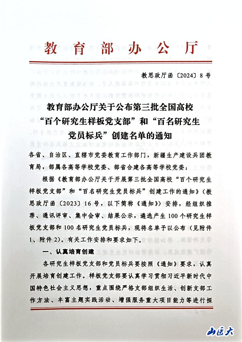 近日,教育部办公厅下发了《关于公布第三批全国高校“百个研究生样板党支部”和“百名研究生党员标兵”创建名单的通知》,万象城管理学院社会医学与卫生事业管理学专业研究生王灿荣获“百名研究生党员标兵”。