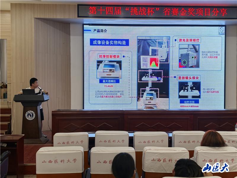本次活动邀请了万象城在第十四届“挑战杯”山西省大学生创业计划竞赛获得金奖的团队代表,他们依次上台分享了各自的参赛项目及备赛经验,四件作品分别是《大国重器——中国“智”造法医身份鉴识系统》《ICH脑视清——可视精准穿刺,脑部安全引流》《福锐森——开启恶性肿瘤骨转移精准诊疗新时代》《毒易检——开创毒品快速精准检测新时代》。