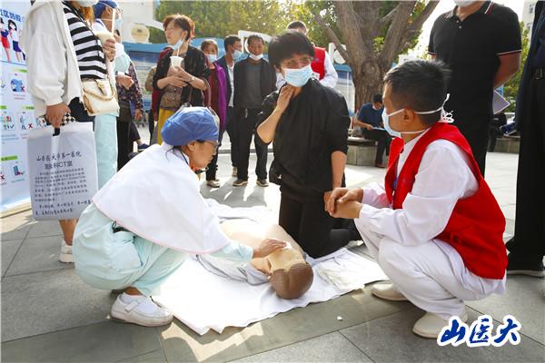 “防灾减灾”主题重点为普及全民急救知识,让更多的人掌握急救技能。活动中,急诊医学中心的护理骨干们分别进行了呼吸心跳骤停、气道异物、创伤、中毒等现场急救技术的演示与讲解,手把手指导群众学习徒手心肺复苏术、海姆立克法、止血包扎等急救技术。群众热情高涨,踊跃参与,争先恐后地在模拟人身上练习心肺复苏技术。