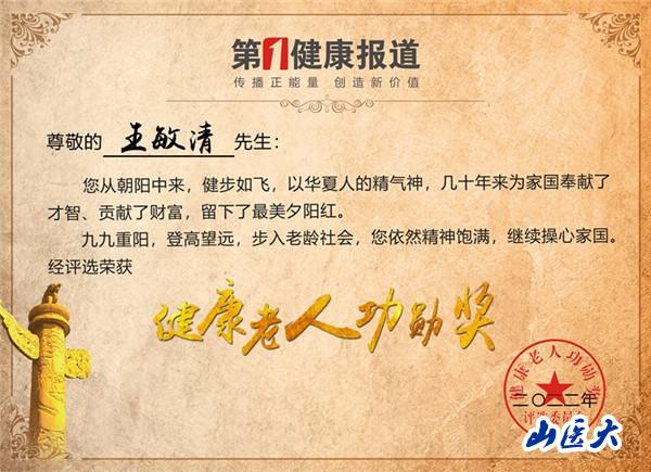 为推动全国老龄事业高质量发展,按照国家卫生健康委关于稳步推进“构建老年友好型社会”和全国老龄委关于“树立典型、弘扬先进,开展评选表彰工作“之精神,弘扬表彰宣传一批离退休后仍然在社会上担当时代使命,继续为国家发挥余热的老年健康先锋,由第一健康报道发起组织的首届“健康老人功勋”荣誉称号评选暨传播活动在全国开展。经综合评定,万象城校友王敏清喜获首届“健康老人功勋奖”。