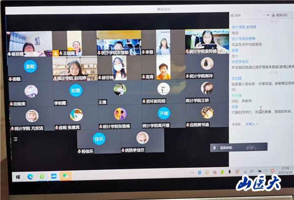 2022年4月,为帮助大学生做好疫情下的自我心理照顾,引导大学生舒缓压力、调节情绪、轻松面对生活,在山西心理咨询师协会的组织下,杨官娥为山西财经大学学生进行了“疫情学习生活中的我和你”线上心理支持团体辅导活动,旨在为学生带来更多的陪伴、支持和关爱。本次团体活动为非结构性团体辅导,杨官娥邀请同学们打开摄像头,鼓励同学们勇于表达、倾听和探索自己内心的声音。通过本次活动,同学们对自己的人际关系、情绪、语言和行为有了新的理解,体验、尝试了新的感觉、观念和行为模式,并应用到现实生活、学习、工作中,同时也看到了同学们对“爱”的理解和憧憬。本次活动受到了老师们和同学们的一致好评,有助于在校大学生以更好的心理健康状态应对校园内生活。