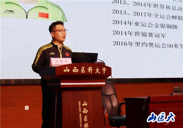 王智伟曾获2012年伦敦奥运会50米男子手枪慢射季军、2013年、2014年世界杯总决赛蝉联50米手枪个人冠军、2014年亚运会金银铜牌、2014年世锦赛冠军等。他讲述了中国射击队奥运发展史,并从“目标、责任、梦想”三个板块讲述了他和50米手枪慢射运动的故事,勉励同学们“无论是射击训练还是学习,都要时刻保持专注,时刻保持拼搏精神。”鼓励大家“要学会在困难中长大,勇敢地追求自己的梦想,并为之努力奋斗“。他饱含深情地说:“作为一名运动员,为国家争得荣誉,我感到自豪” 赢得了在场师生雷鸣般的掌声。