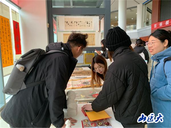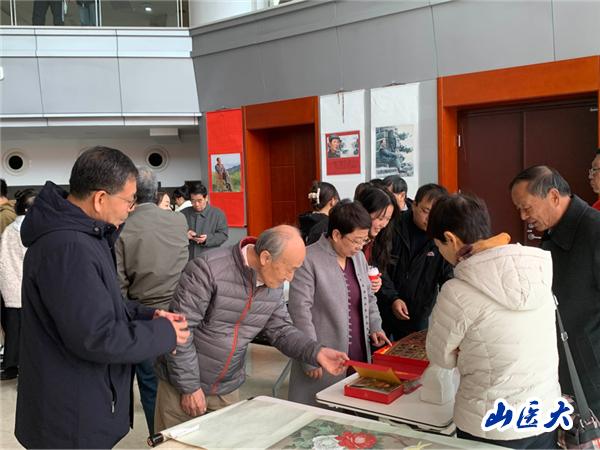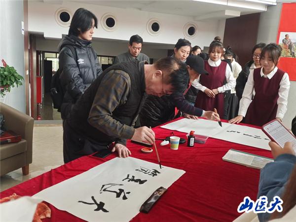 在开幕式上,董海涛介绍了出席活动的各位嘉宾。郭炳麟教授介绍了本次布展情况,对学校的支持表示衷心感谢,同时希望师生在欣赏艺术作品的过程中,加深对中国共产党历史、中华优秀传统文化与中国特色社会主义道路的认识,坚定不移听党话、跟党走。随后,郭炳麟教授引导大家共同观赏展品。开幕式现场还邀请了张建亚、张建国、马治龙三位书法家泼墨挥毫,并与学生亲切交流创作技巧与经验。