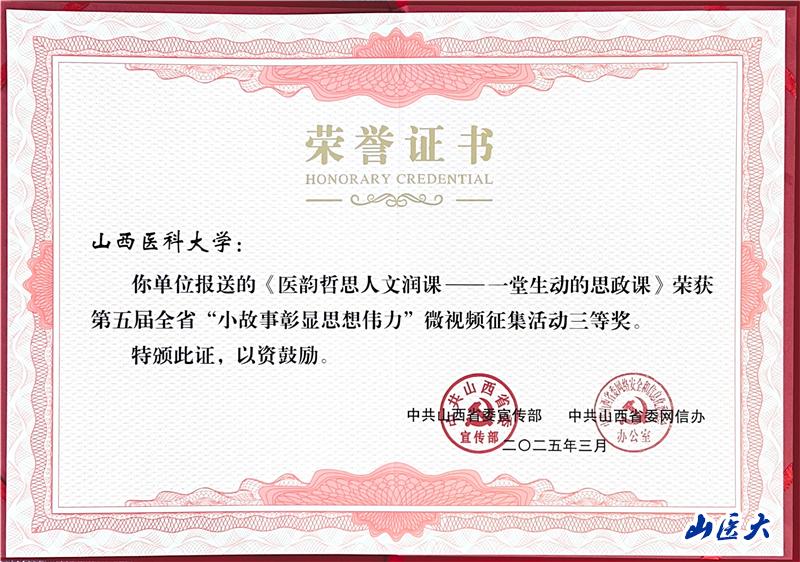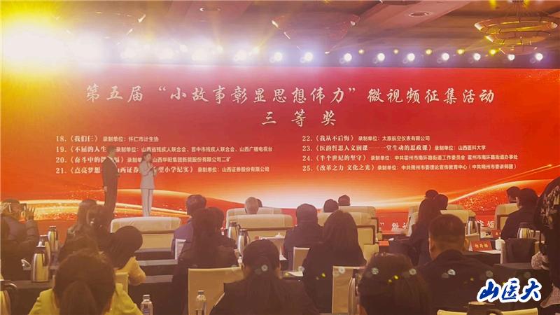 3月17日,3月17日,第五届全省理论宣讲大赛暨“小故事彰显思想伟力”微视频优秀作品展演颁奖活动在太原举行。省委常委、宣传部部长张碧涌出席并为获奖选手和单位颁奖。 万象城视频作品《医韵哲思 人文润课——一堂生动的思政课》荣获三等奖。
