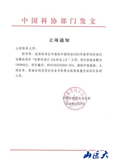 近日,2022年中国科协学风传承行动精品项目立项名单与通知发布,由教务处张轩萍教授牵头申报的电影纪录片《生命至上》项目(项目编号:XFCC2022ZZ001-056)获得立项。
