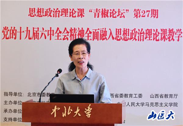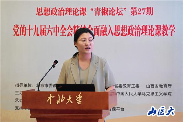 为了更好地推动学习贯彻党的十九届六中全会精神工作不断往深里走、往实里走、往心里走,引导广大思政课教师将党的十九届六中全会精神科学准确地融入思政课教学活动全过程,7月27日,第27期全国思想政治理论课“青椒论坛”在中北大学举行,来自北京、山西的六位优秀青年教师和两位名师,围绕“党的十九届六中全会精神全面融入思想政治理论课教学”进行了教学展示和名师分享。马克思主义学院院长苏果云教授和青年教师孙英博士参加了此次论坛。