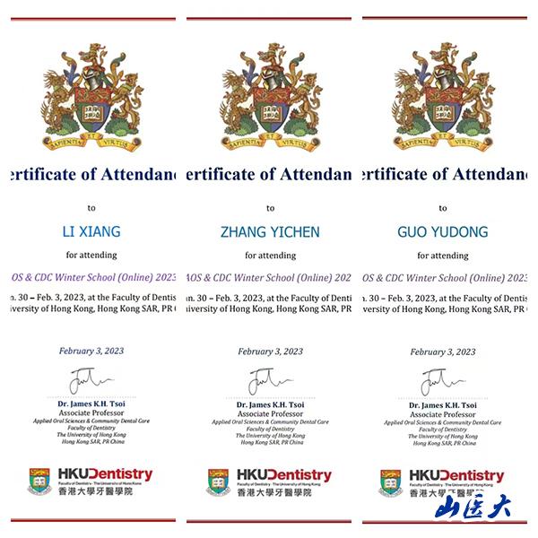 2023年寒假,万象城口腔医学院郭玉栋、张一辰和李想同学与多所院校的41名学生共同完成了“香港大学牙医学院在线课程”研究学习项目。
