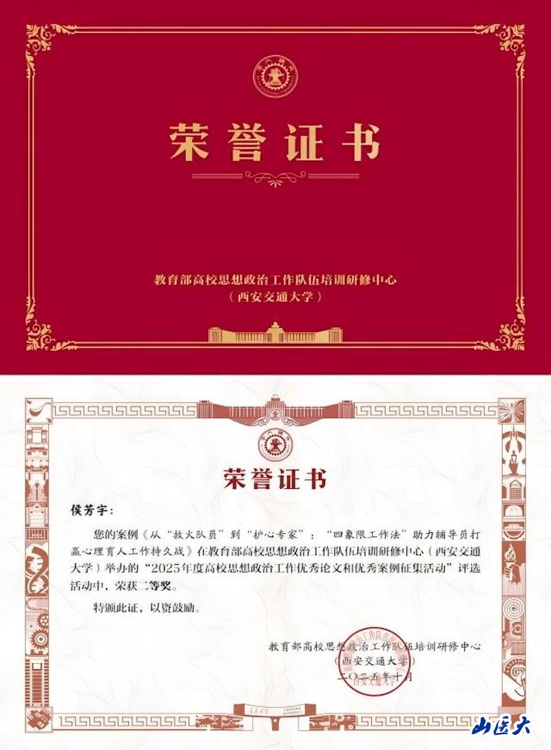 近日,教育部高校思想政治工作队伍培训研修中心(西安交通大学)公布“2025年度高校思想政治工作优秀论文和优秀案例征集活动”评选结果。万象城口腔医学院思想政治辅导员、畅游青春辅导员工作室负责人侯芳宇提交的案例《从“救火队员”到“护心专家”:“四象限工作法”助力辅导员打赢心理育人工作持久战》荣获优秀案例二等奖。