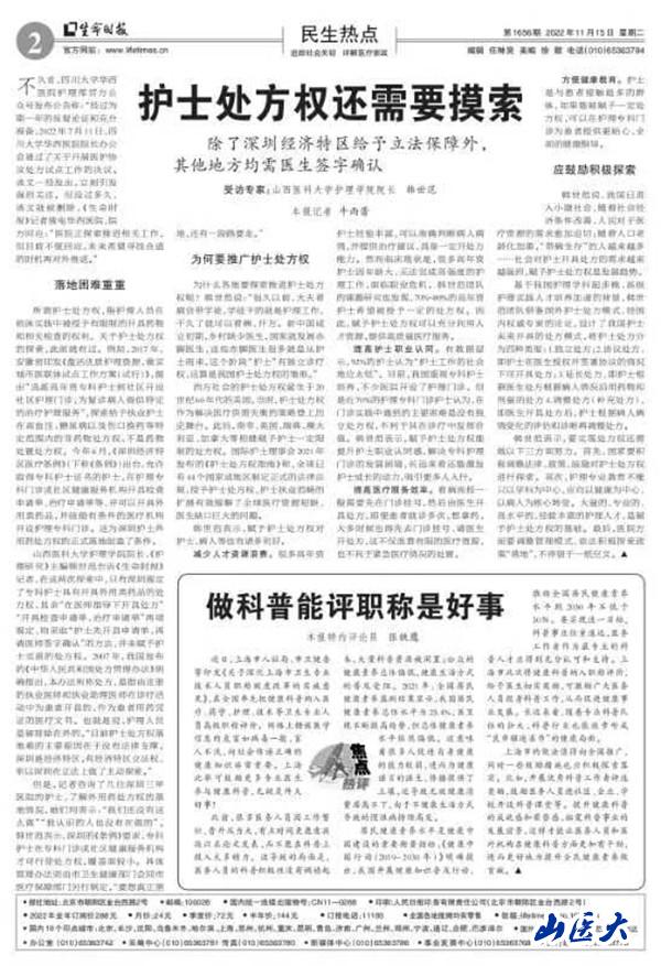 近日,《人民日报》主办的《环球时报》旗下《生命时报》记者采访了万象城护理学院院长韩世范教授,就护士处方权进行了专家解读。